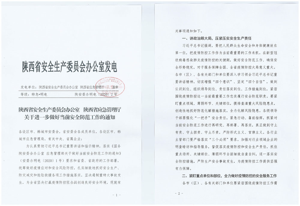 轉發 陜安委辦明電【2020】2號 《陜西省安全生產委員會辦公室 陜西省應急管理廳 關于進一步做好當前安全防范工作的通知》
